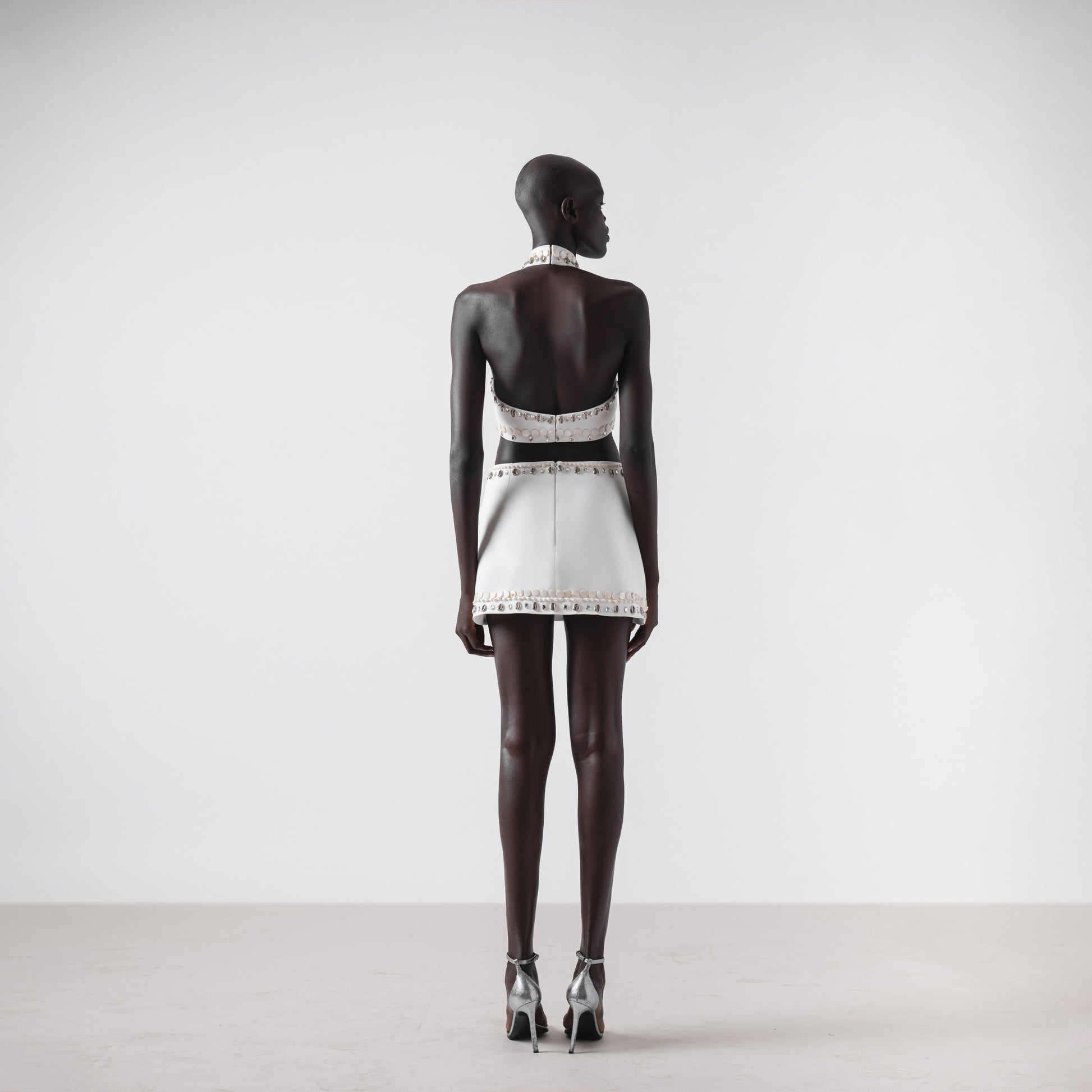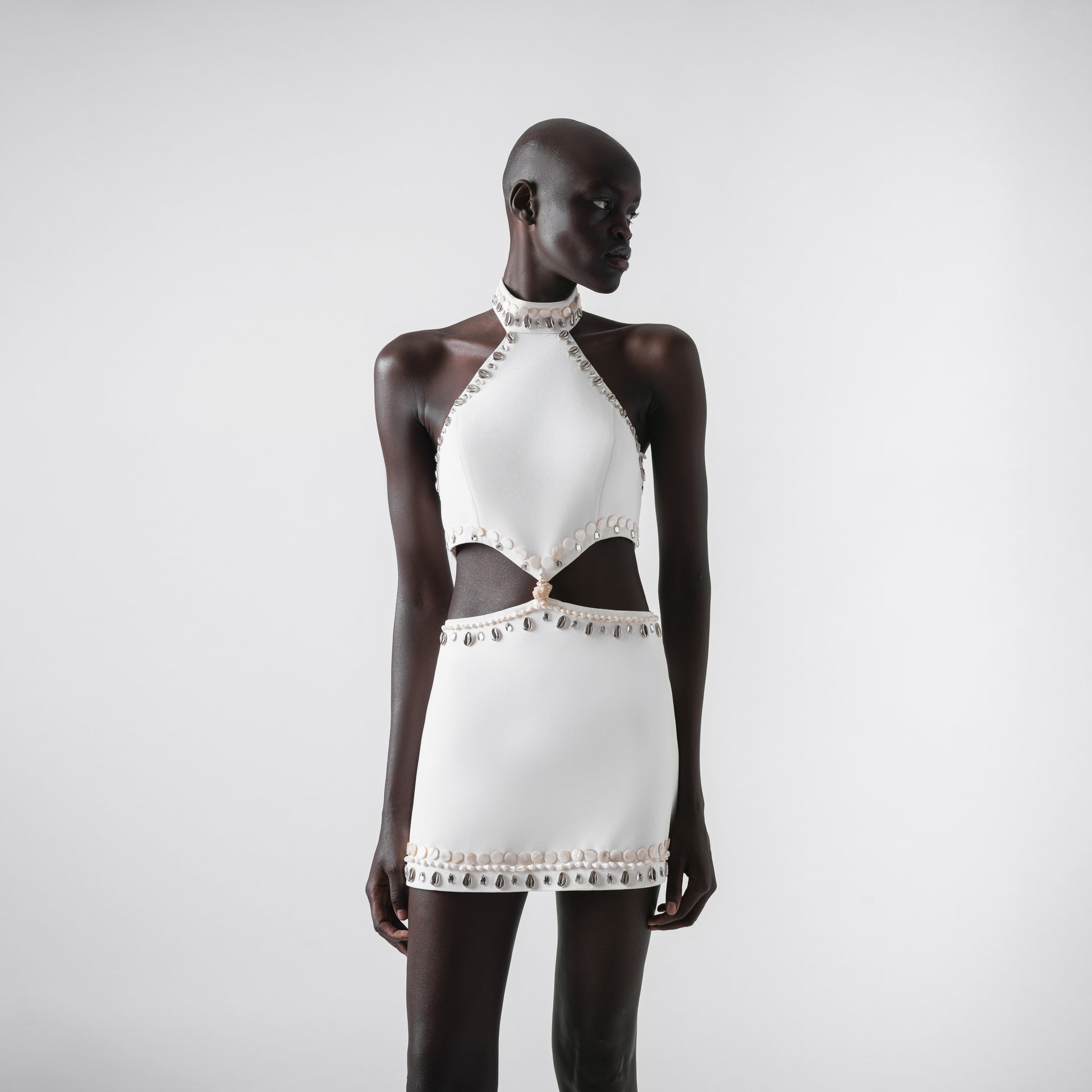 A high-neck mini dress in rezmir fabric featuring a cut-out at the waist that extends from front to back. The top includes internal baleine for structure and is fully lined in matching rezmir fabric. The piece is finished with hand-beaded detailing.