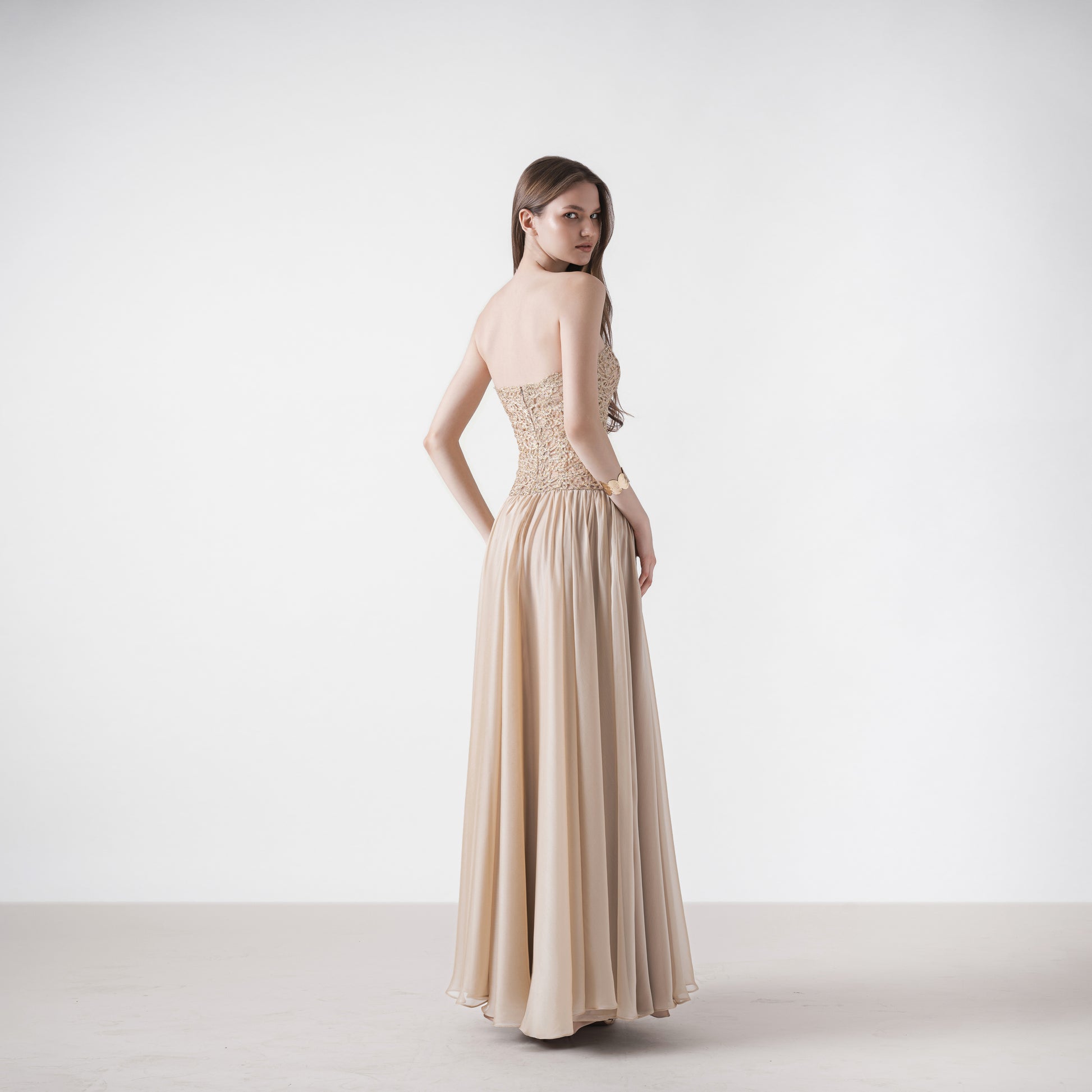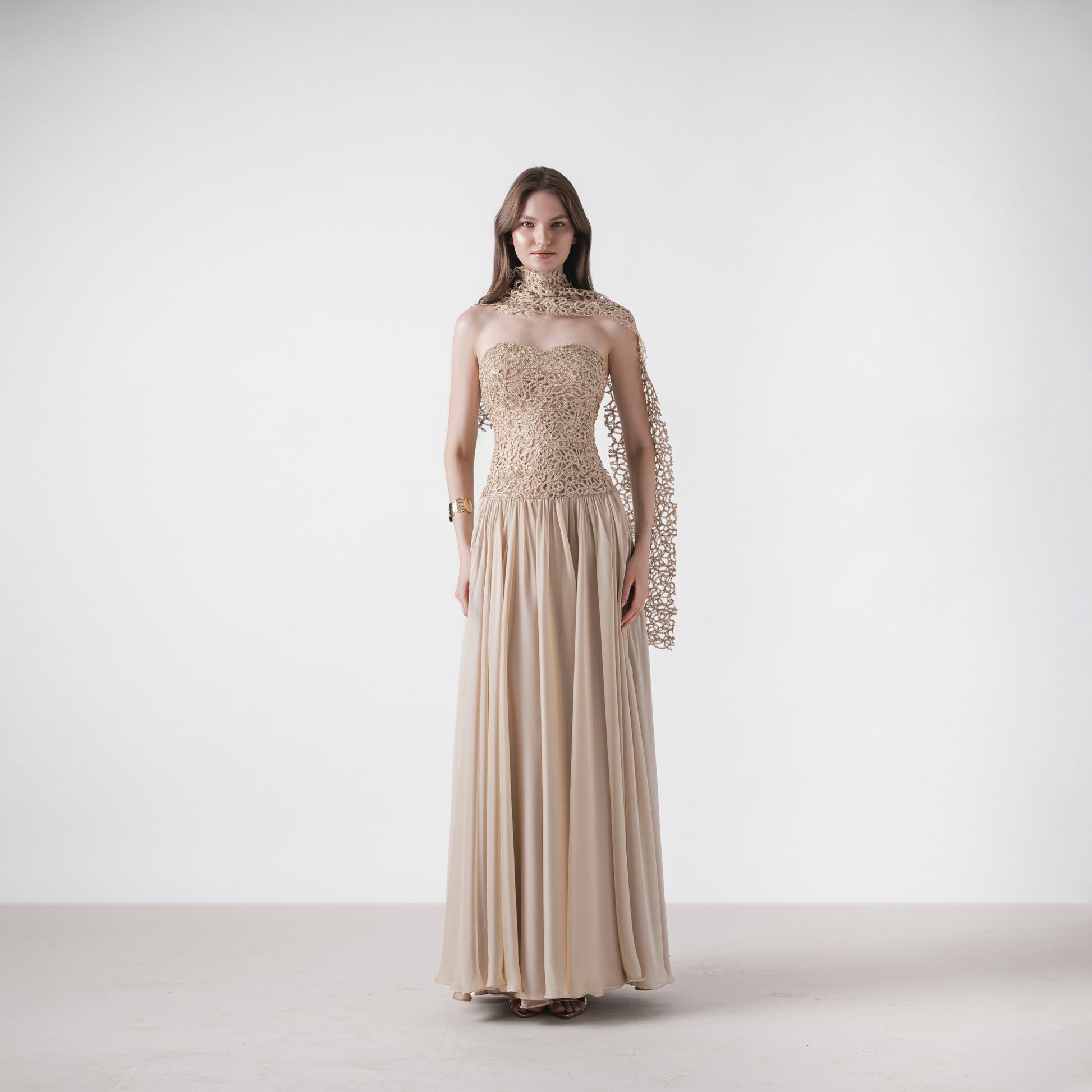 A maxi dress with a corset-style top crafted from corded lace, paired with a gathered chiffon skirt.