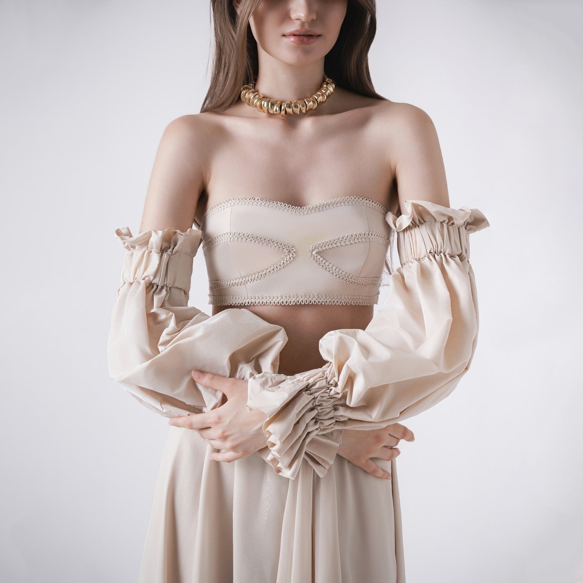 A two-piece set featuring a structured bustier crop top in taffeta with a textured finish. It is paired with a layered chiffon maxi skirt and accompanied by voluminous sleeves.