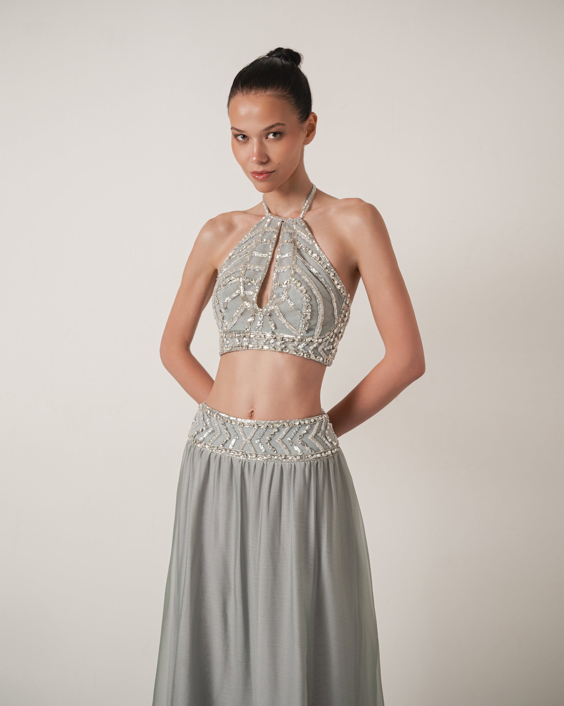 Two-piece set crafted from chiffon in a muted grey tone. The halter-style top features a keyhole neckline and detailed hand applied beadwork in linear and geometric patterns that add texture and structure. The look is completed with a floor-length skirt that drapes fluidly, creating a balanced and modern silhouette.