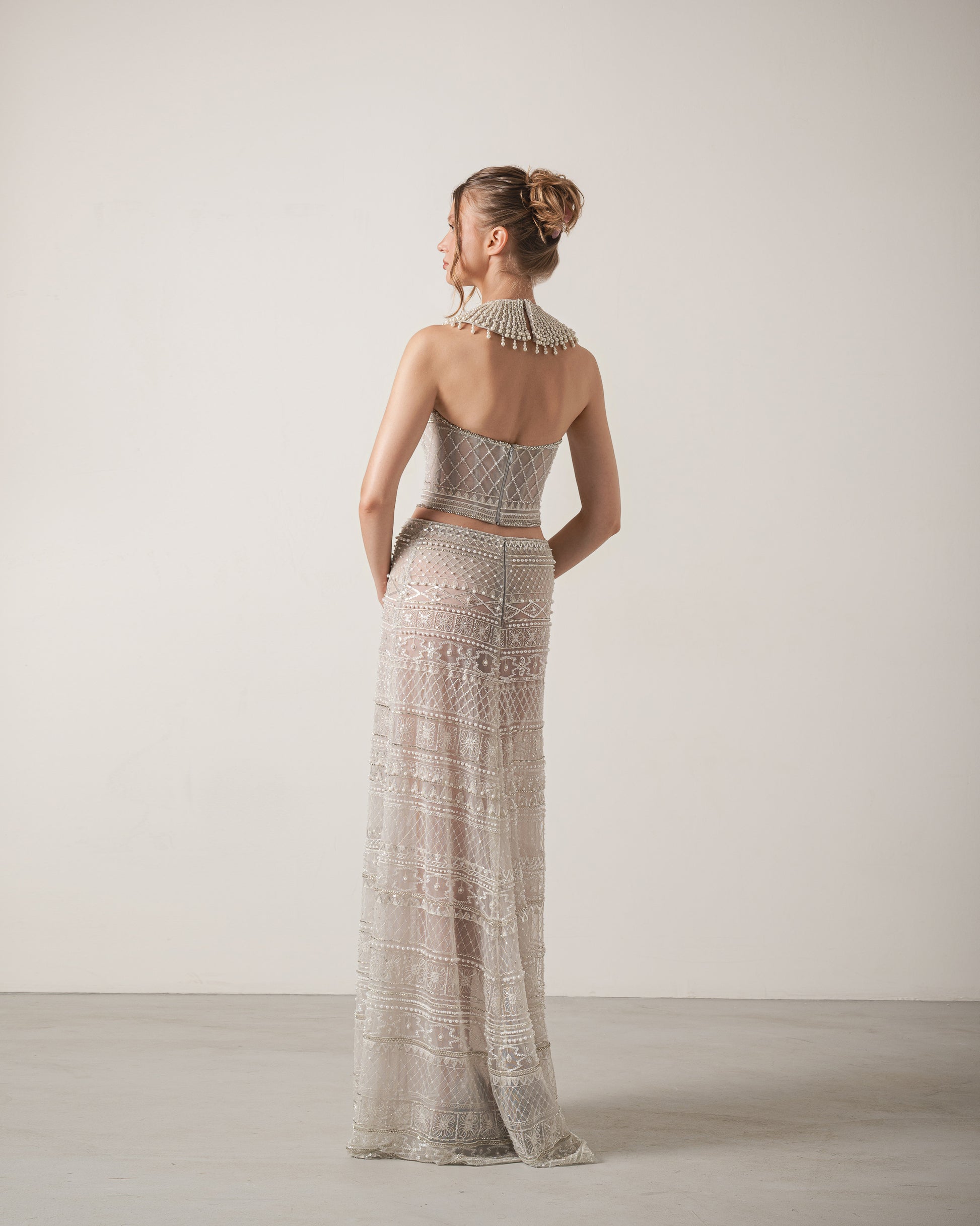 Two-piece set crafted from sheer tulle in a soft grey tone, fully hand-beaded with intricate thread and bead embroidery. The cropped top features a hand-beaded collar and structured detailing throughout the set complementing the straight, floor-length skirt. Geometric and linear patterns that add depth and texture, creating a detailed and contemporary look.
