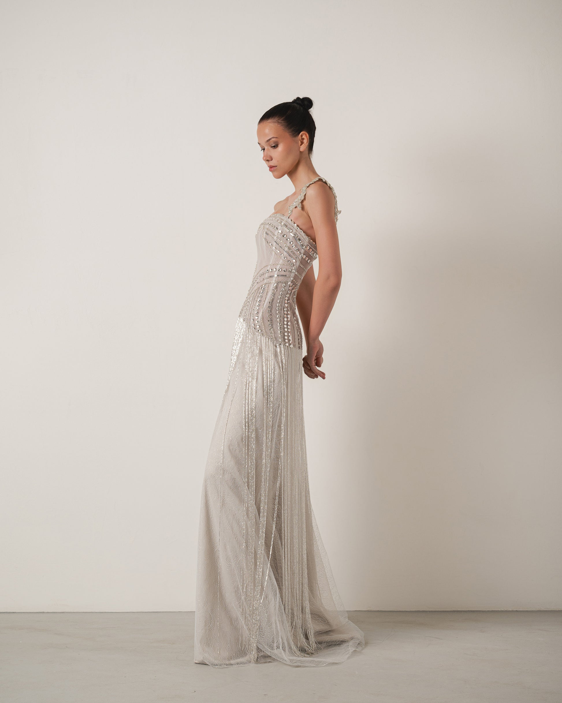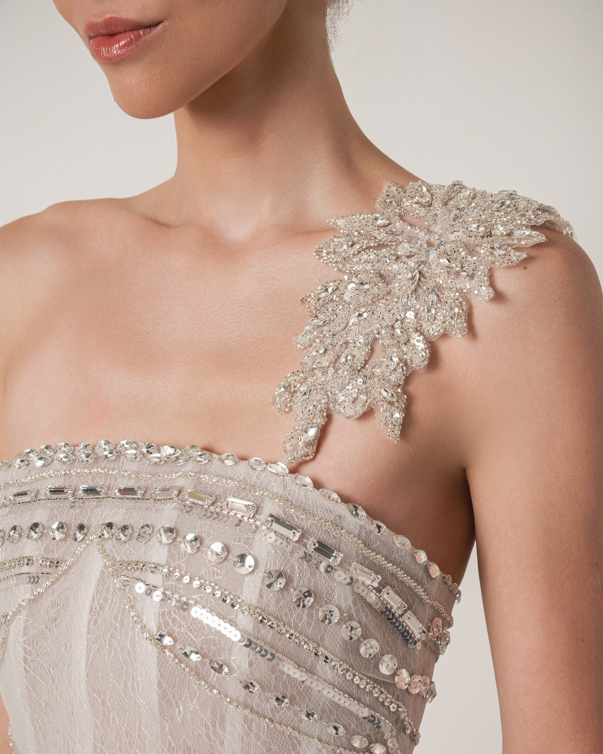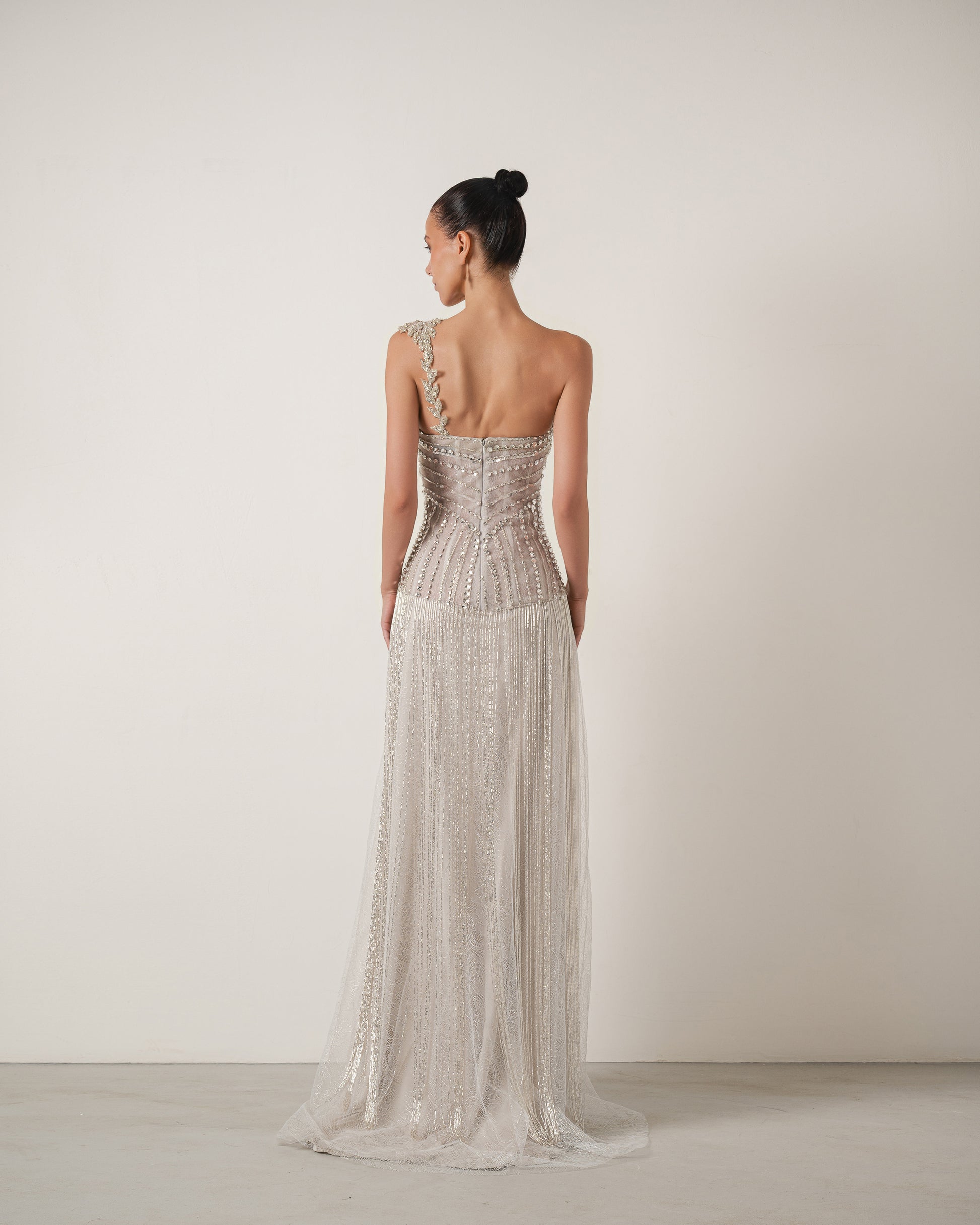 An elegant strapless gown hand-beaded with charlestone fringes over intricate lace. The geometric embroidery sculpts the silhouette, while a single floral appliqué graces the shoulder for a touch of refined femininity.