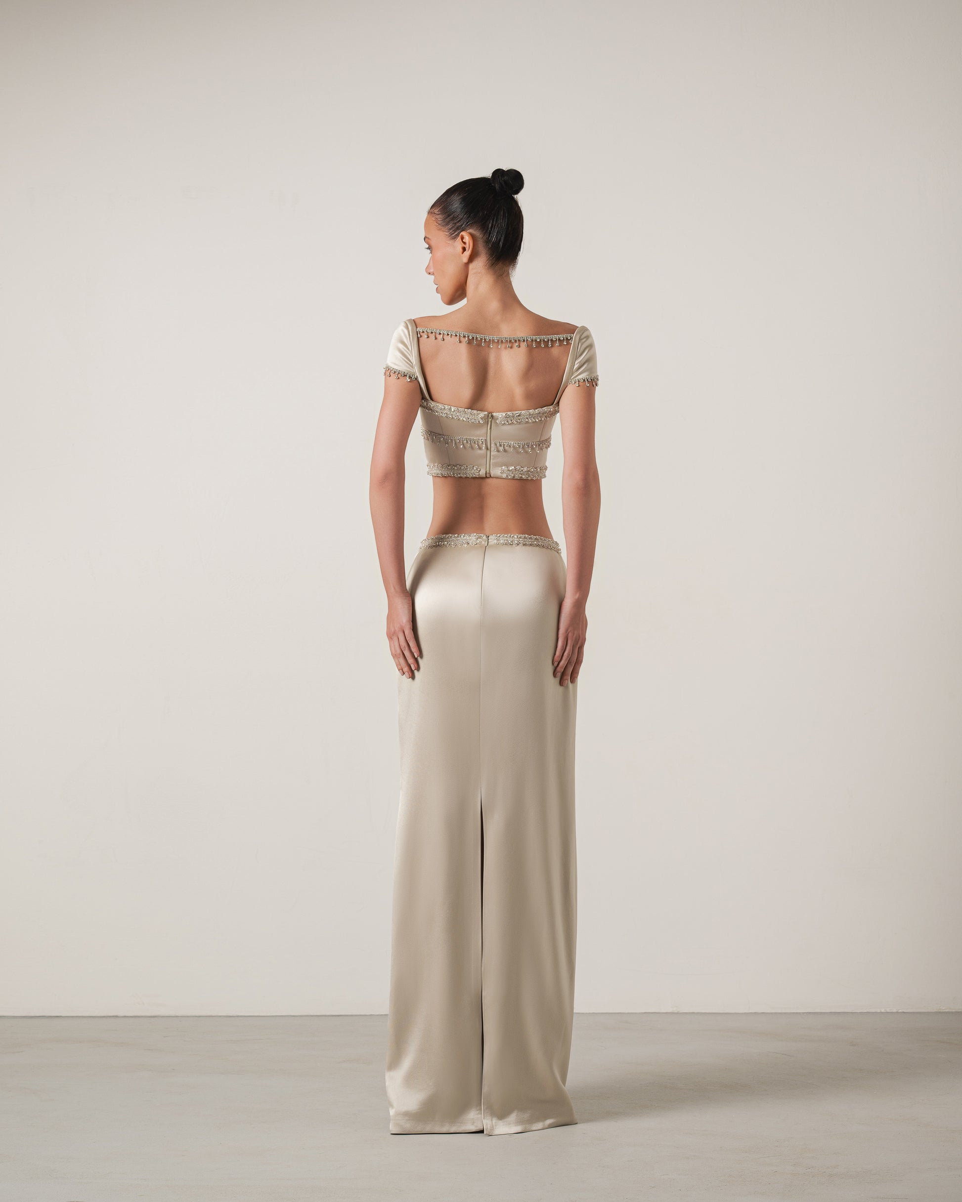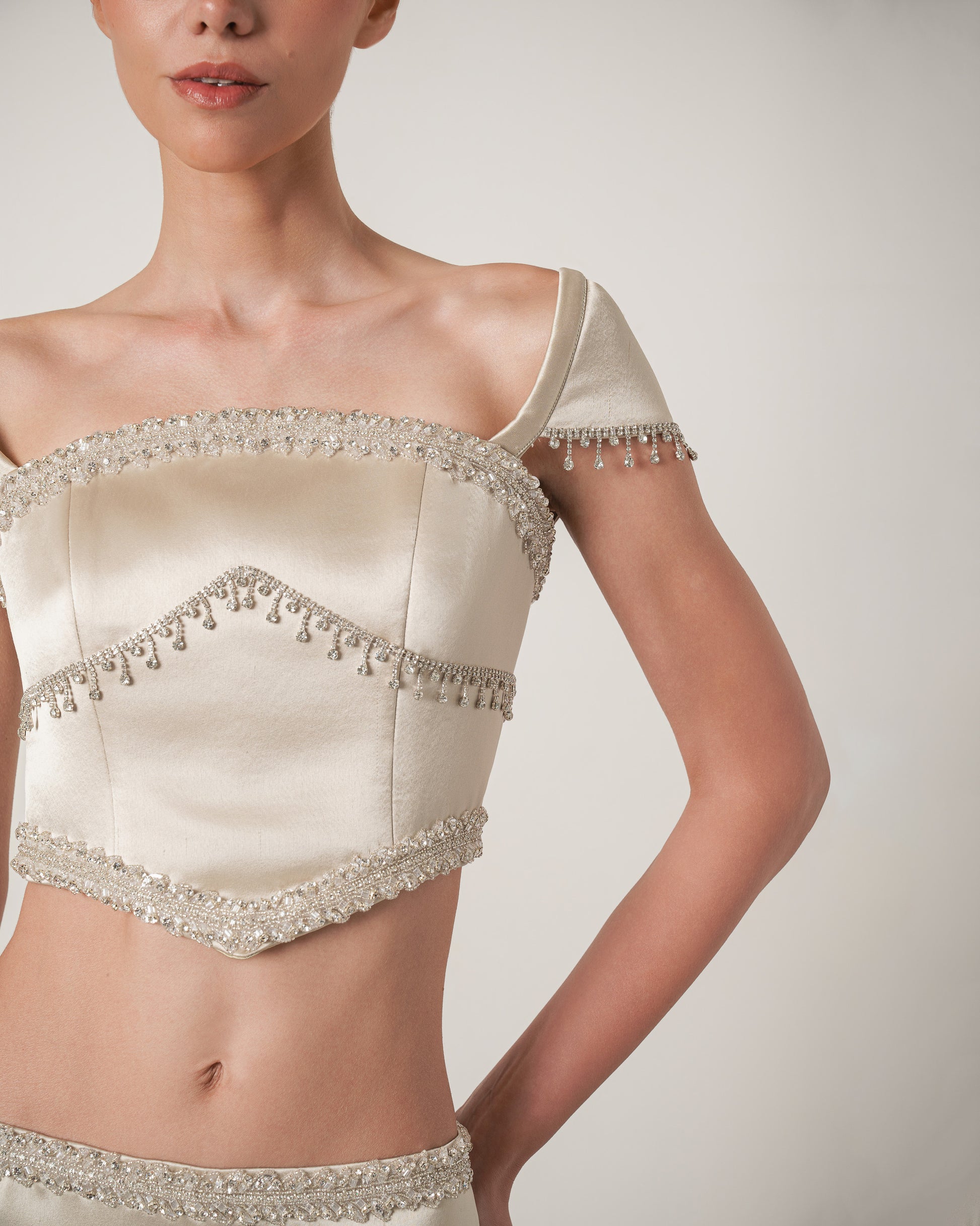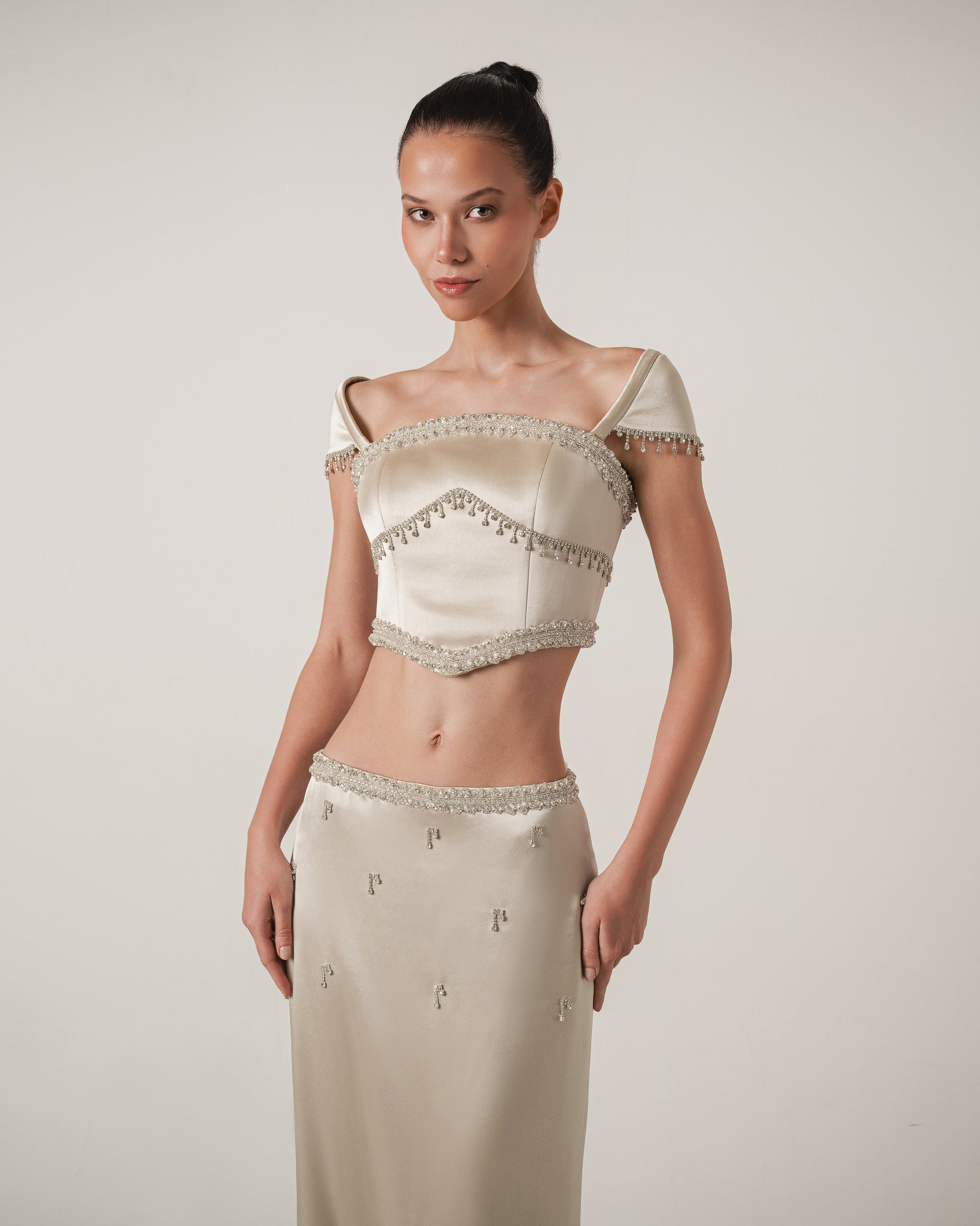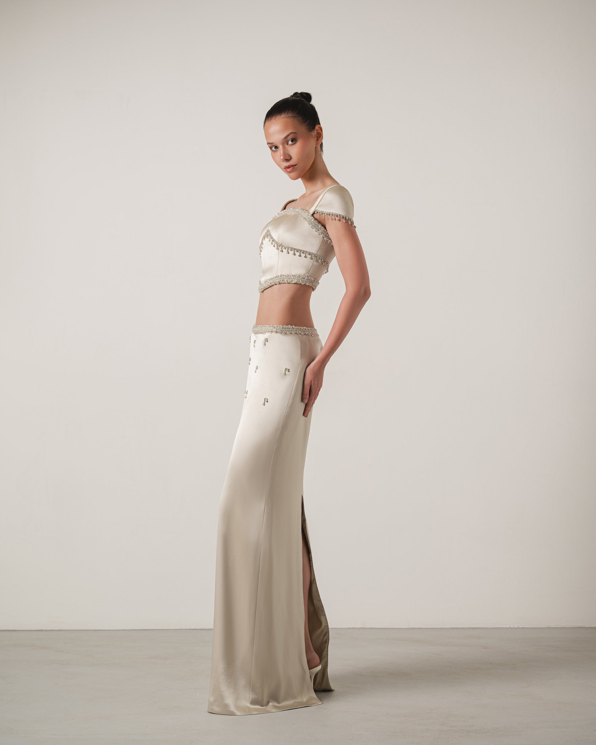 A satin two-piece set embellished with hand-applied crystal details. The off-shoulder top and sleek skirt create a modern silhouette, refined with fine bead detailing.
