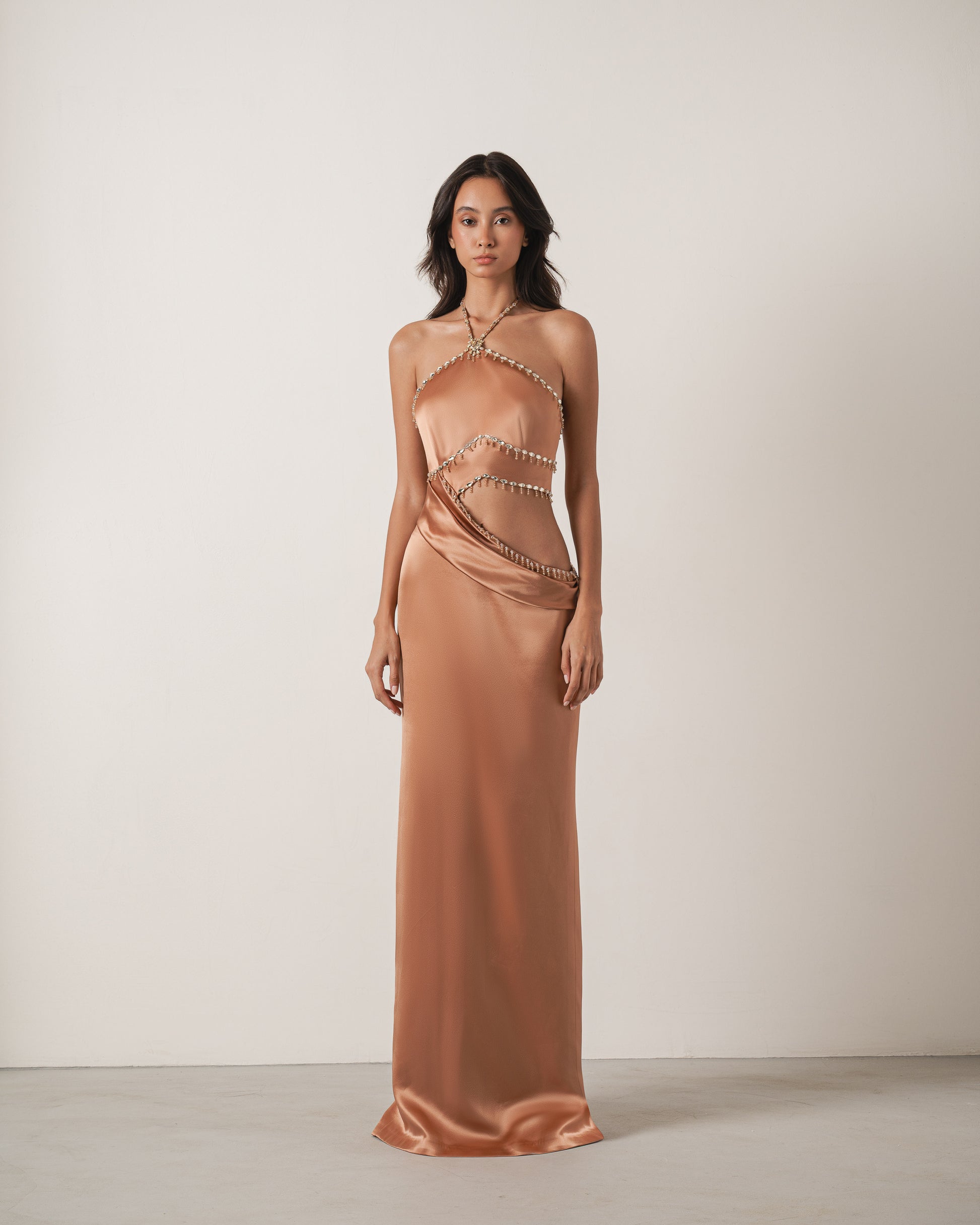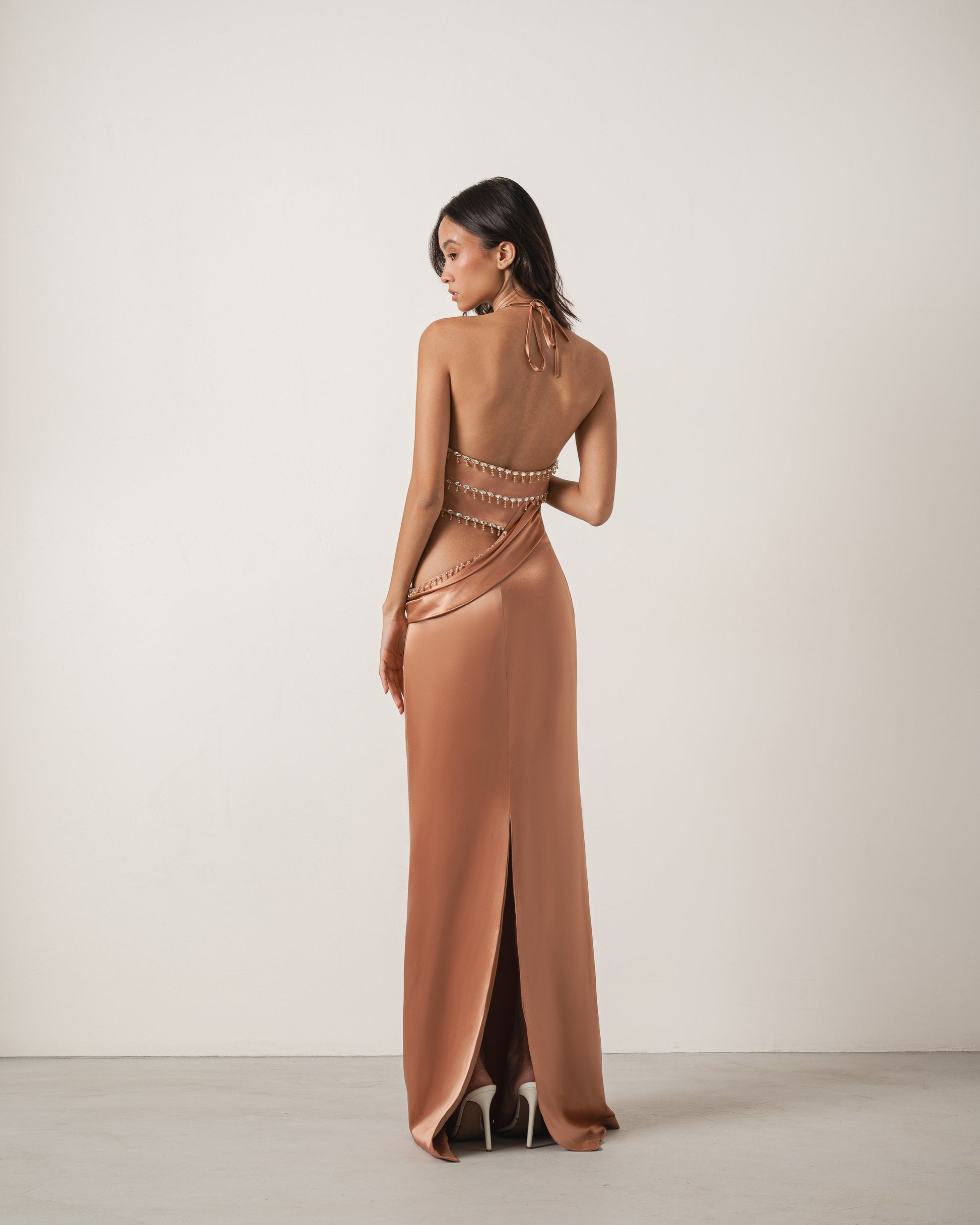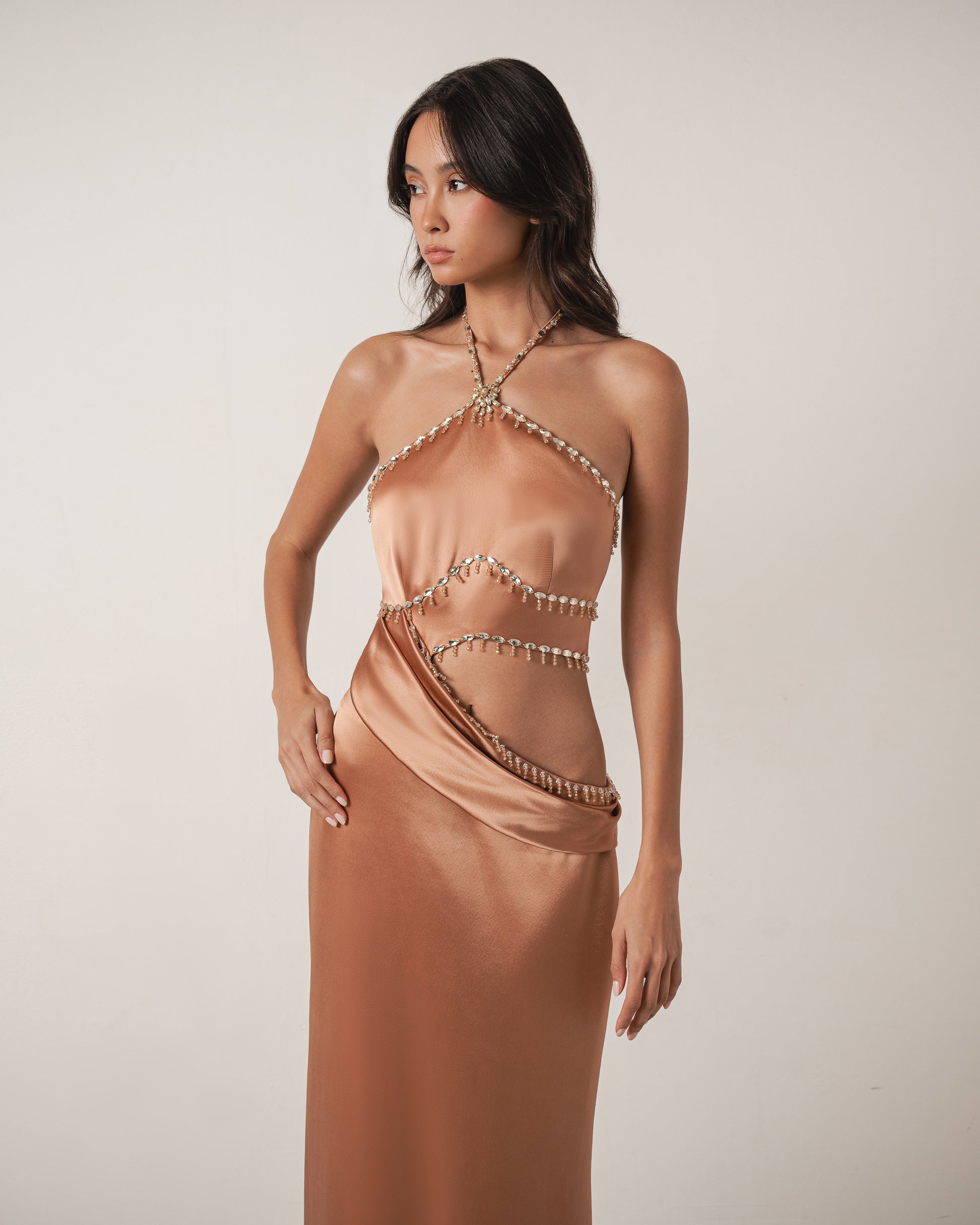 A copper satin gown featuring an asymmetrical silhouette and a cutout embellished with intricate crystal beading that wraps around the bodice, creating a sculptural effect.