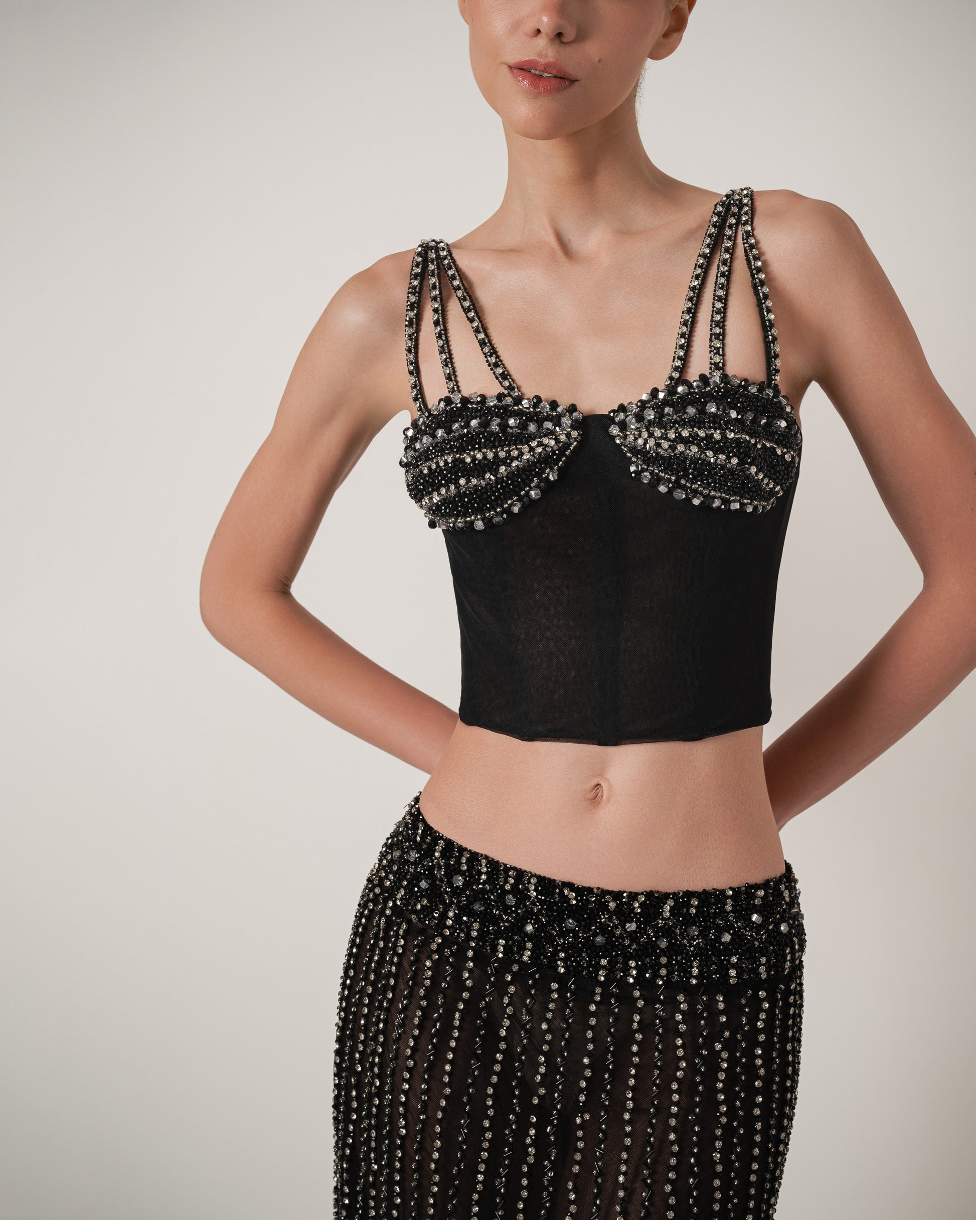Black two-piece look featuring a fitted top with hand-beaded cups and straps detailing, paired with a flowing beaded skirt.