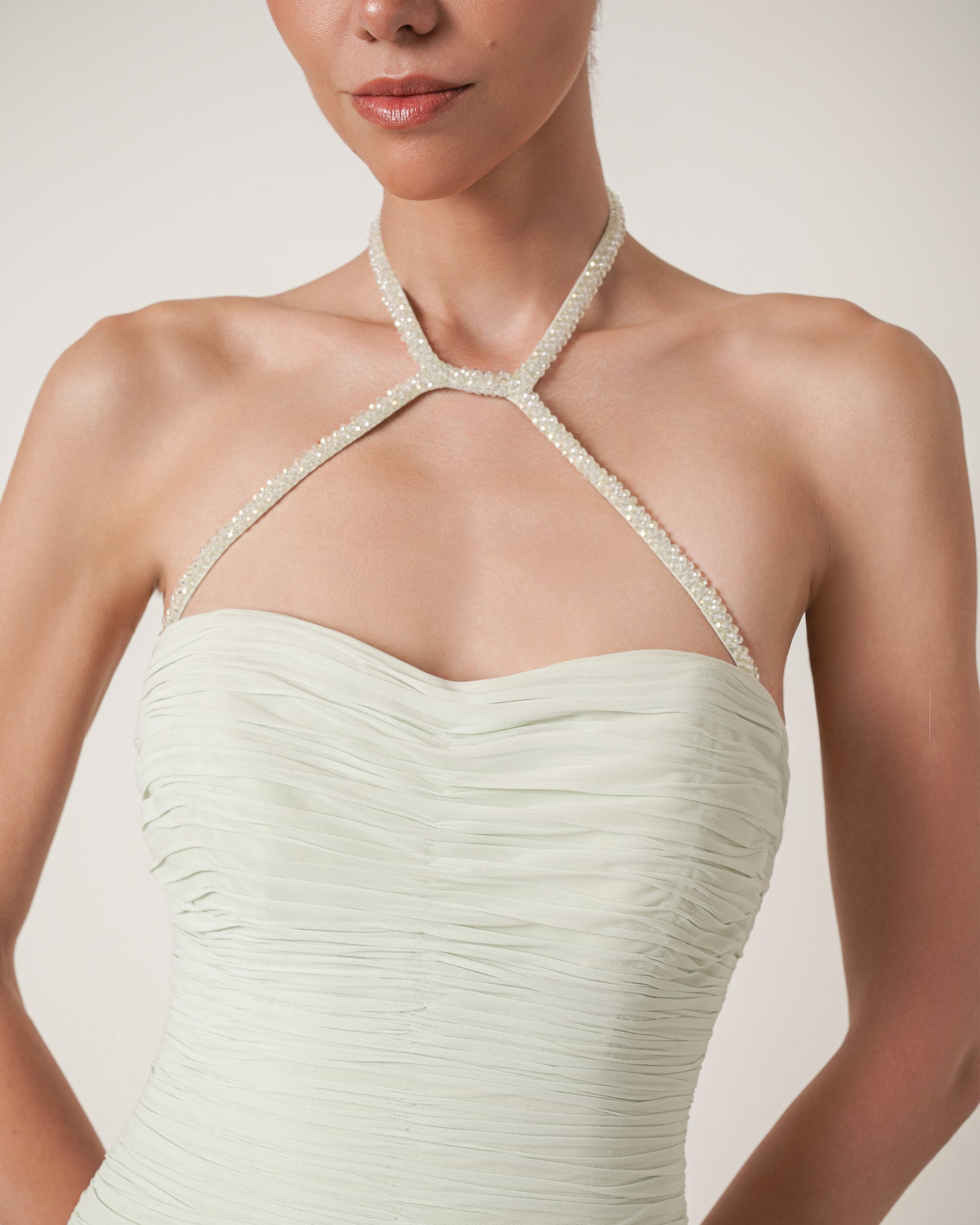 A sage green gown crafted from soft chiffon. The design features a draped bodice with a beaded hulter straps and one-shoulder cape detail that flows gracefully to the side. The skirt falls in smooth gatherings for a fluid silhouette.